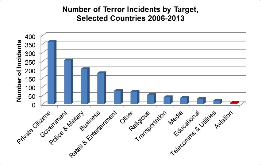Furthermore, the 1,347 events in the GTD included: 86 events involving banks; 40 events involving Retail/Grocery/ Bakery; 26 events involving multinational corporations; 20 events involving restaurants, bars, and cafés; and 18 events involving Entertainment/Cultural/Stadiums/Casinos. This clearly suggests that commerce and shopping or entertainment venues are more likely to be targeted than aviation.
