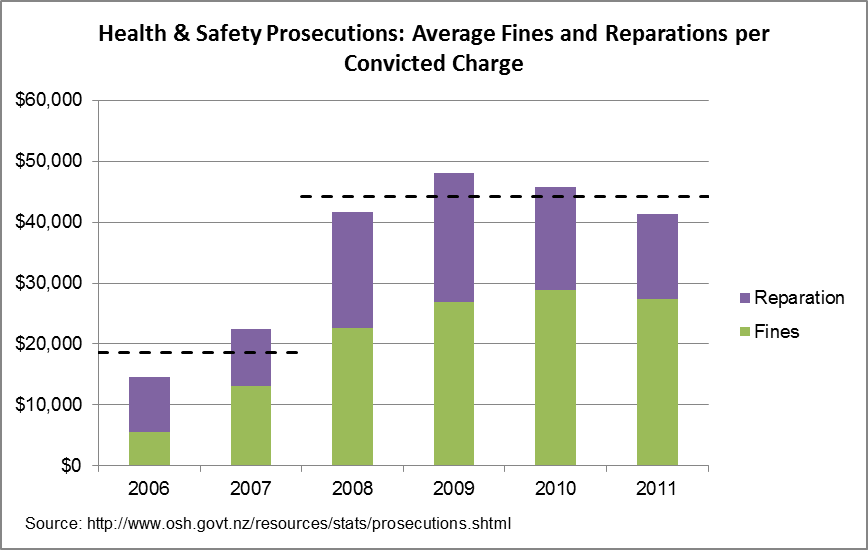 The Department of Labour publishes statistics on health and safety prosecutions, starting at 2006. The chart below shows the average fines and reparations